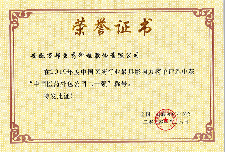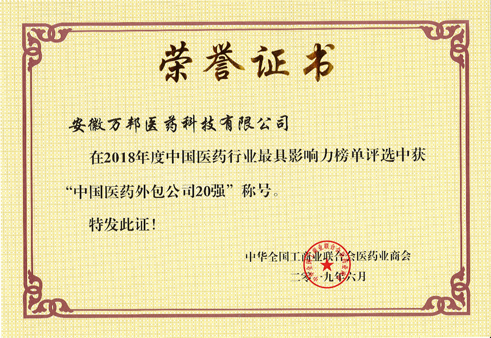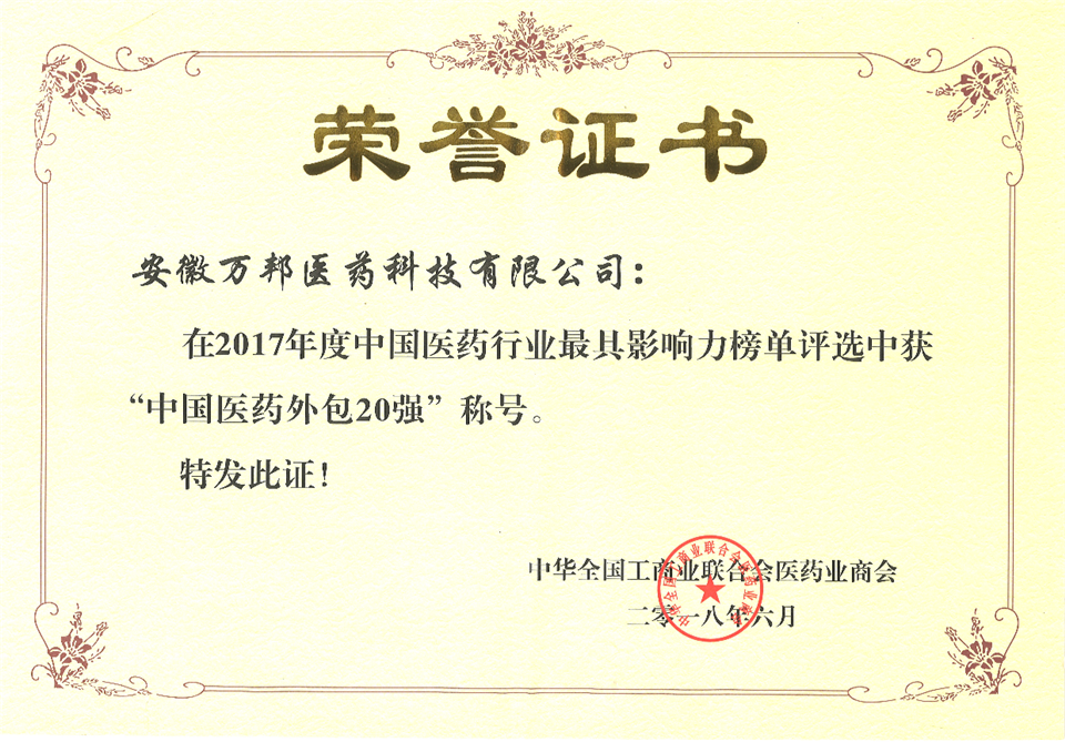 2017中國(guó)醫(yī)藥外包20強(qiáng)證書(shū) |
