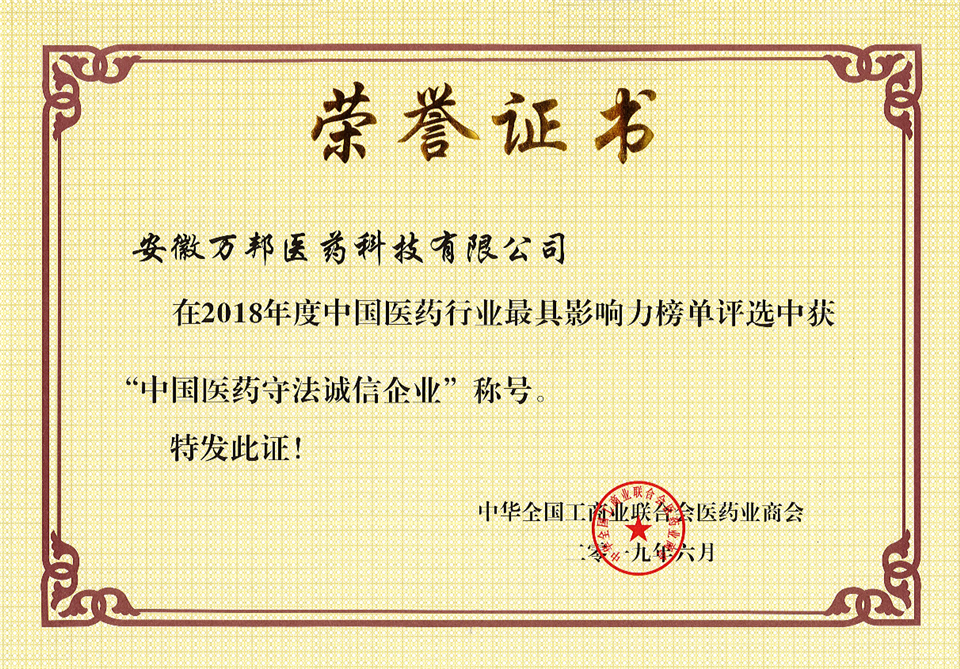 2018年中國(guó)醫(yī)藥守法誠(chéng)信企業(yè) |