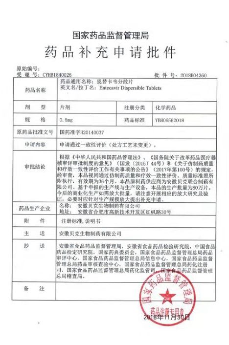 2018年12月3日,安徽貝克生物的恩替卡韋分散片順利通過仿制藥質(zhì)量和療效一致性評價,我司為該項目提供從藥學研究到BE試驗的一站式服務(wù)。該產(chǎn)品是安徽省第一個通過一致性評價的品種。