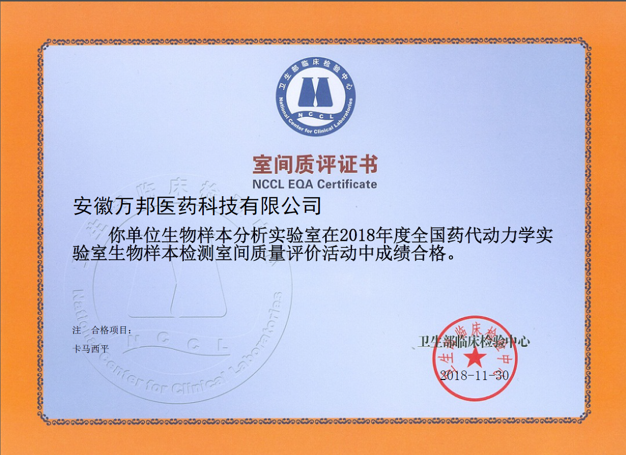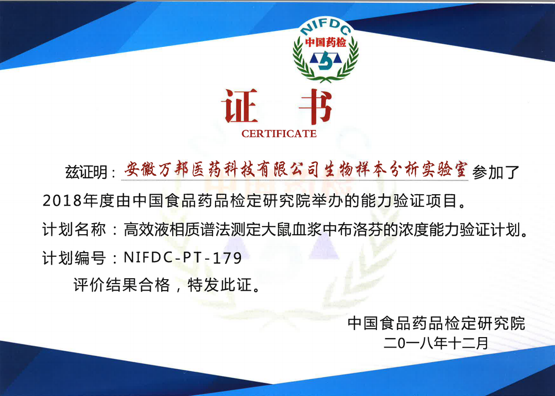 2018年12月安徽萬(wàn)邦醫(yī)藥科技有限公司生物樣本分析實(shí)驗(yàn)室順利通過衛(wèi)生部臨床檢驗(yàn)中心的室間質(zhì)評(píng),同時(shí)“高效液相質(zhì)譜法測(cè)定大鼠血漿中布洛芬的濃度能力驗(yàn)證計(jì)劃”通過中國(guó)食品藥品檢定研究院舉辦的能力驗(yàn)證。