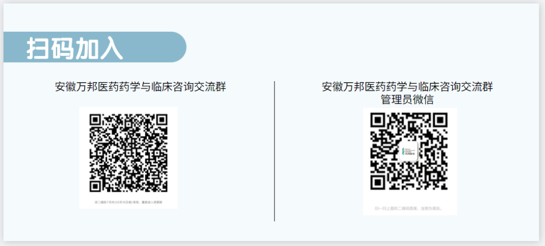 歡迎廣大客戶加入安徽萬邦醫(yī)藥藥學與臨床咨詢交流群,群內(nèi)可與專業(yè)老師交流互動。若群二維碼過期,請?zhí)砑尤汗芾韱T微信通過邀請方式進群!