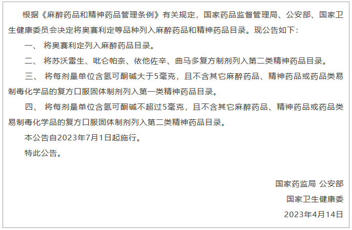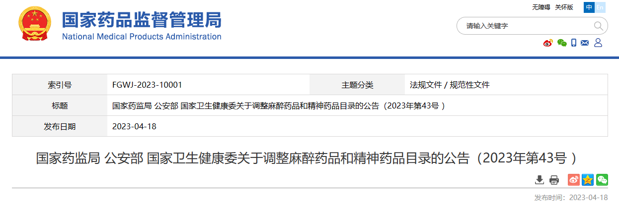 法律法規(guī)|NMPA發(fā)布關(guān)于調(diào)整麻醉藥品和精神藥品目錄的公告